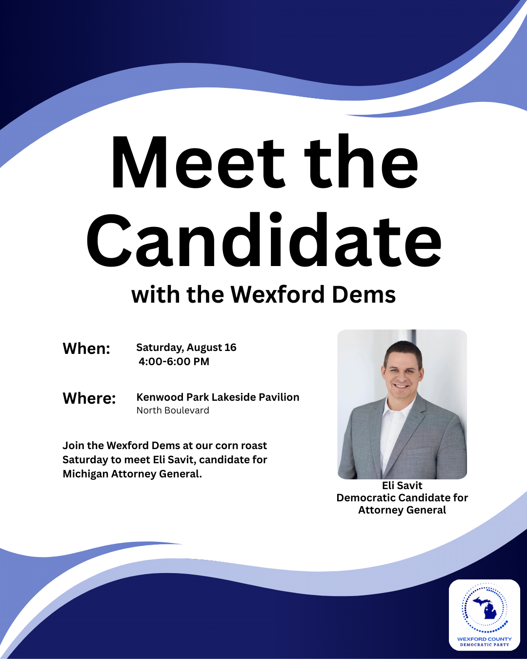 Join the Wexford Dems on Saturday at Kenwood Park to meet Eli Savit, Democratic candidate for Attorney General of Michigan in 2026.